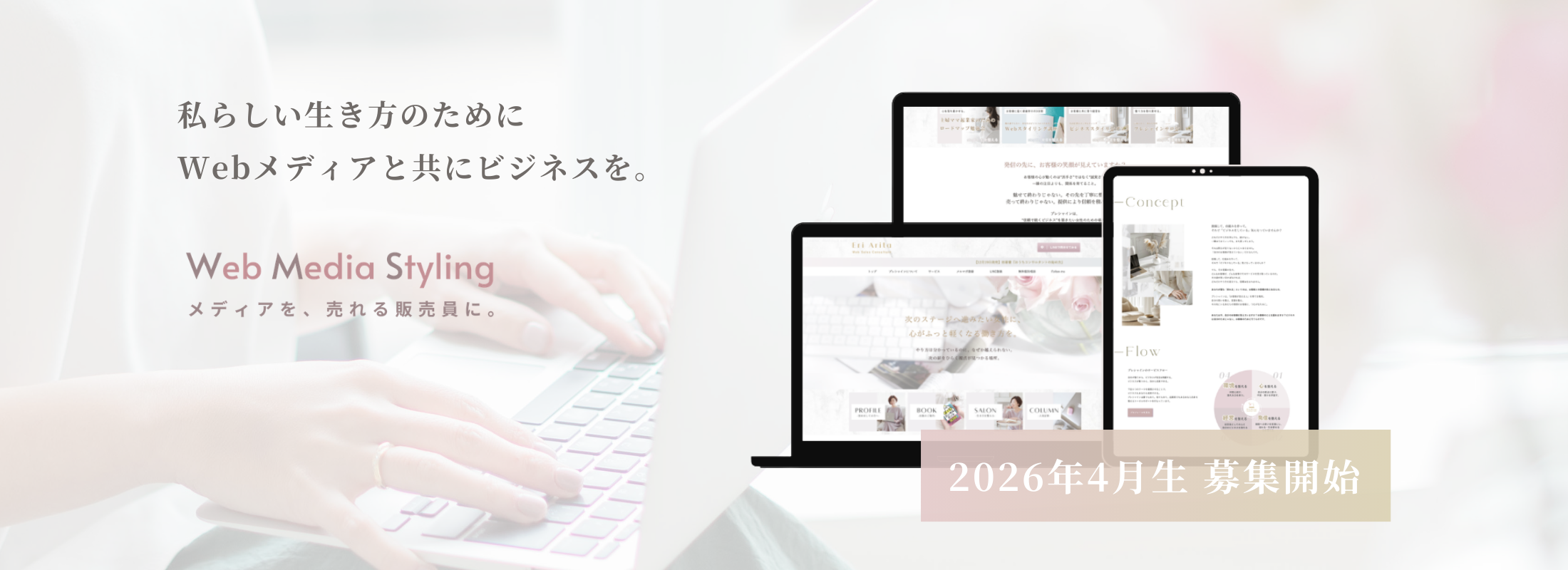 Webメディアスタイリングの4月生の募集を開始しました。 3名前後を予定しております。 有田絵梨一人でのサポートサービスのため、皆様の状況やご希望のWebメディアの在り方によっては、1名でも受付を終了する場合があります。お早めに個別相談にご予約ください。